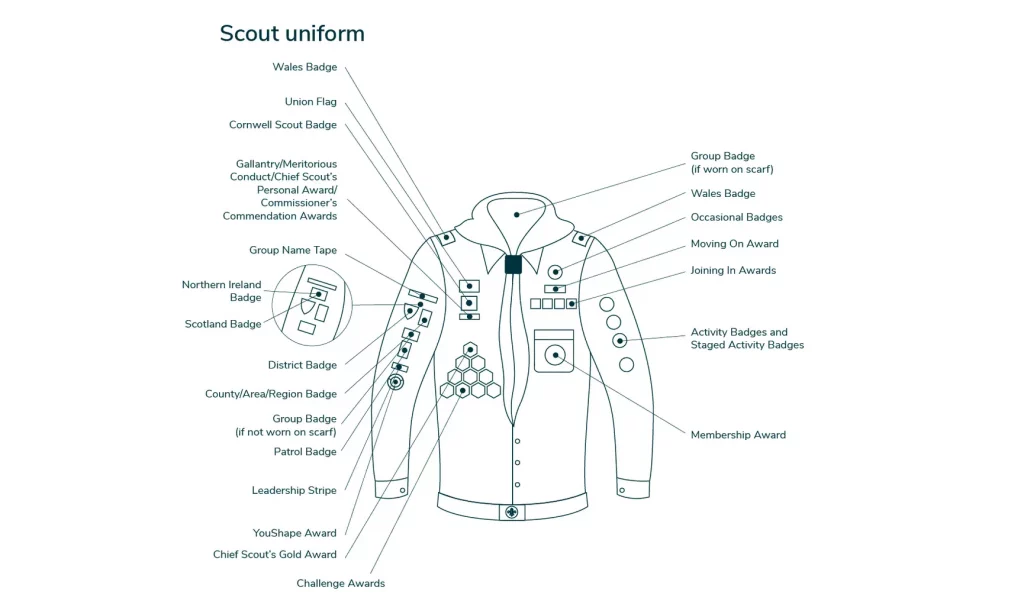 Young Leaders can wear their original Scout badges, along with new ones they earn through the Explorer programme or volunteering scheme. Badge placement varies depending on district/unit but follows similar guidelines.